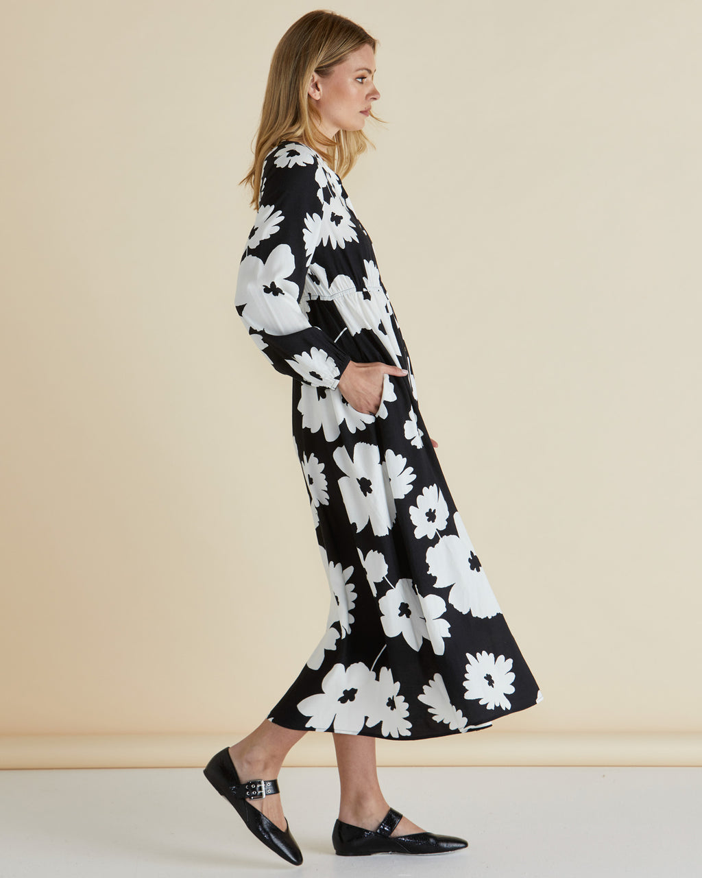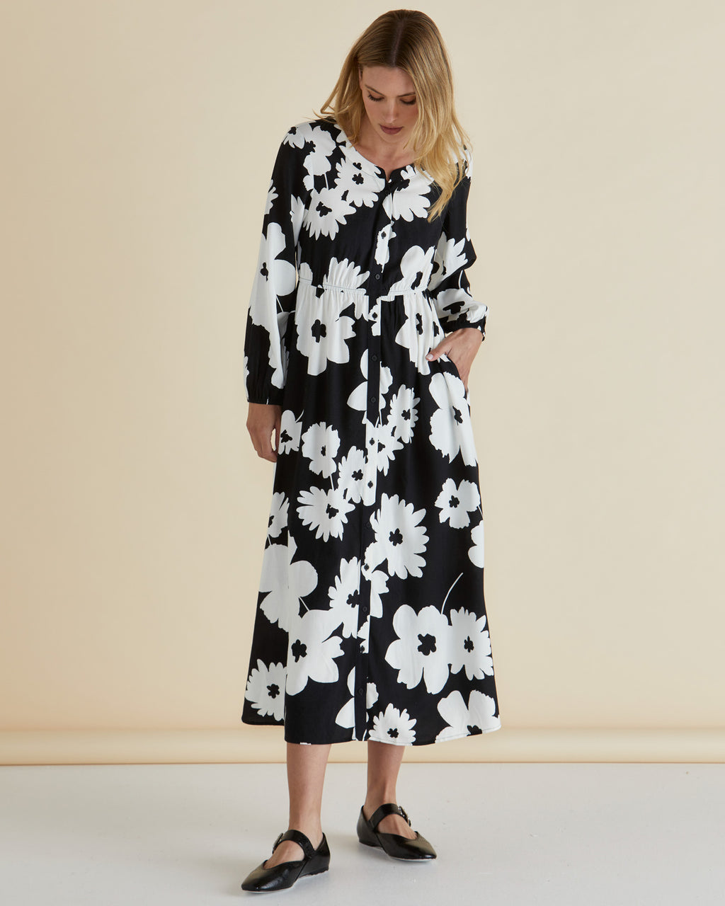 The Aries Dress is a stylish shirt dress made from soft viscose feel fabric. Featuring a button-up front, billow sleeves, and an elastic waist, this dress offers a flattering, relaxed fit. Perfect for casual outings or dressed up with accessories, the Aries Dress brings effortless style to your wardrobe.