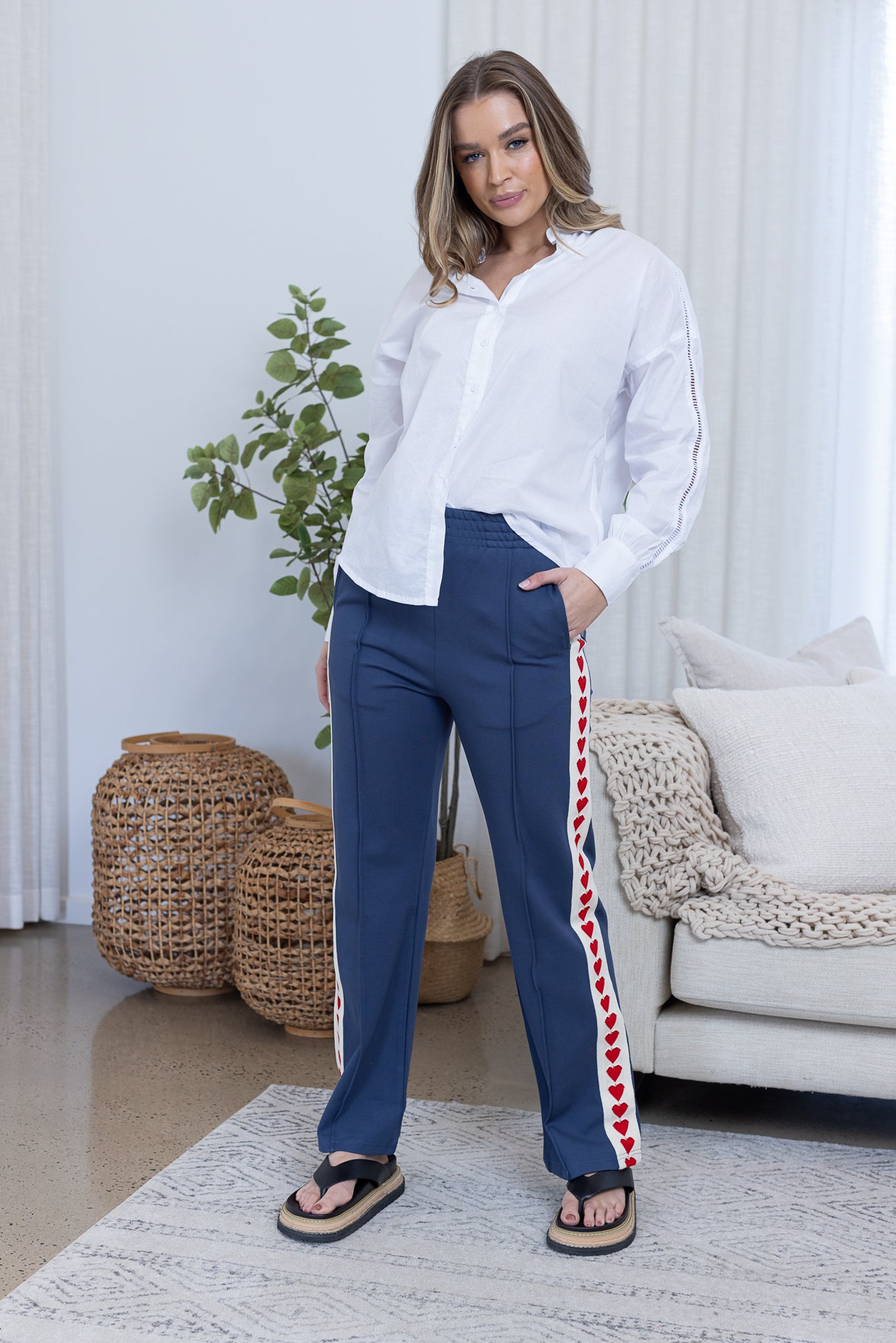 Make a statement with your everyday style - these navy pants feature playful red heart detailing down the sides for a bold, sporty edge. Style with a crisp white shirt or a basic tee for casual coffee dates, school pickups or off-duty errands.