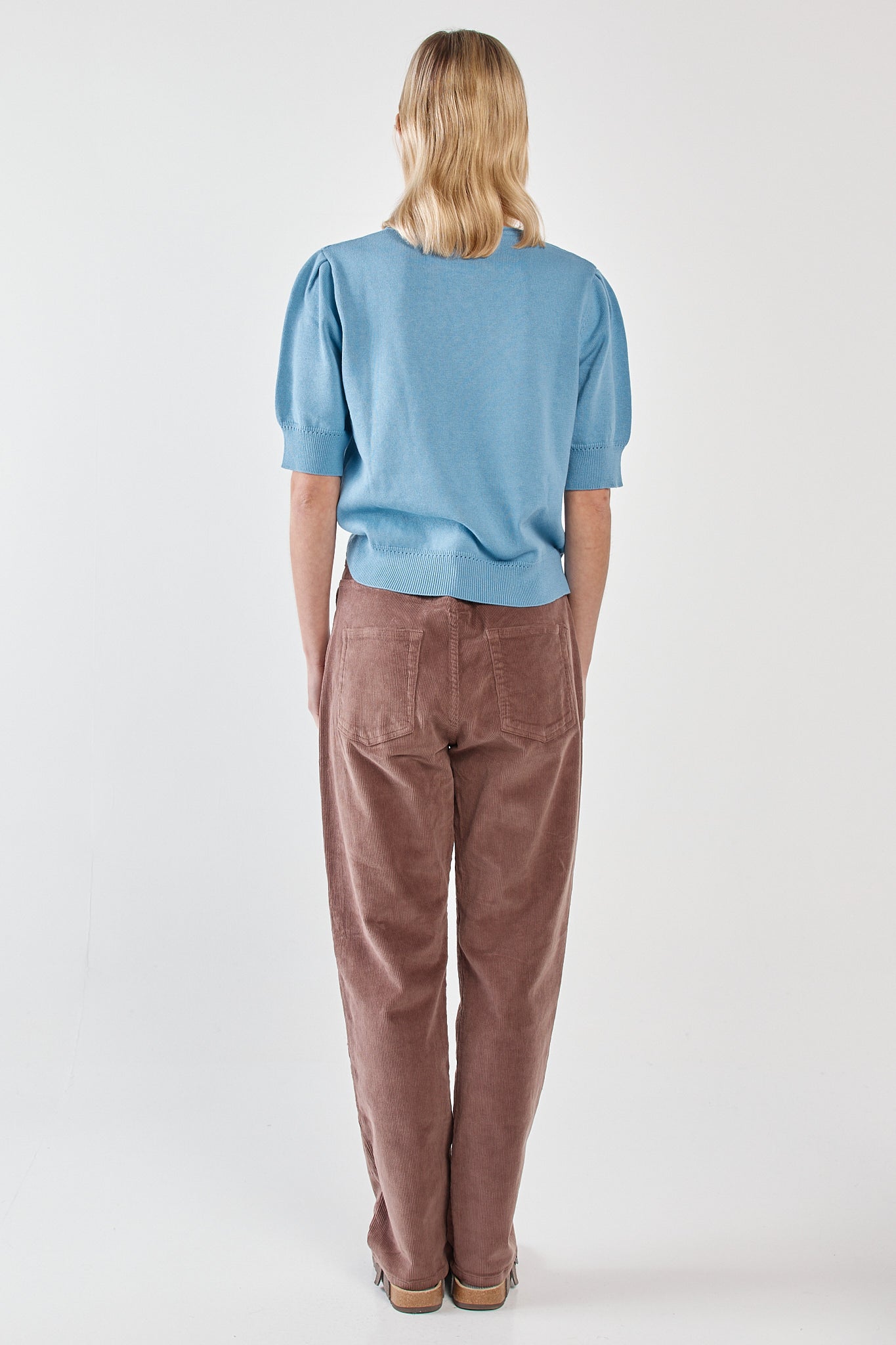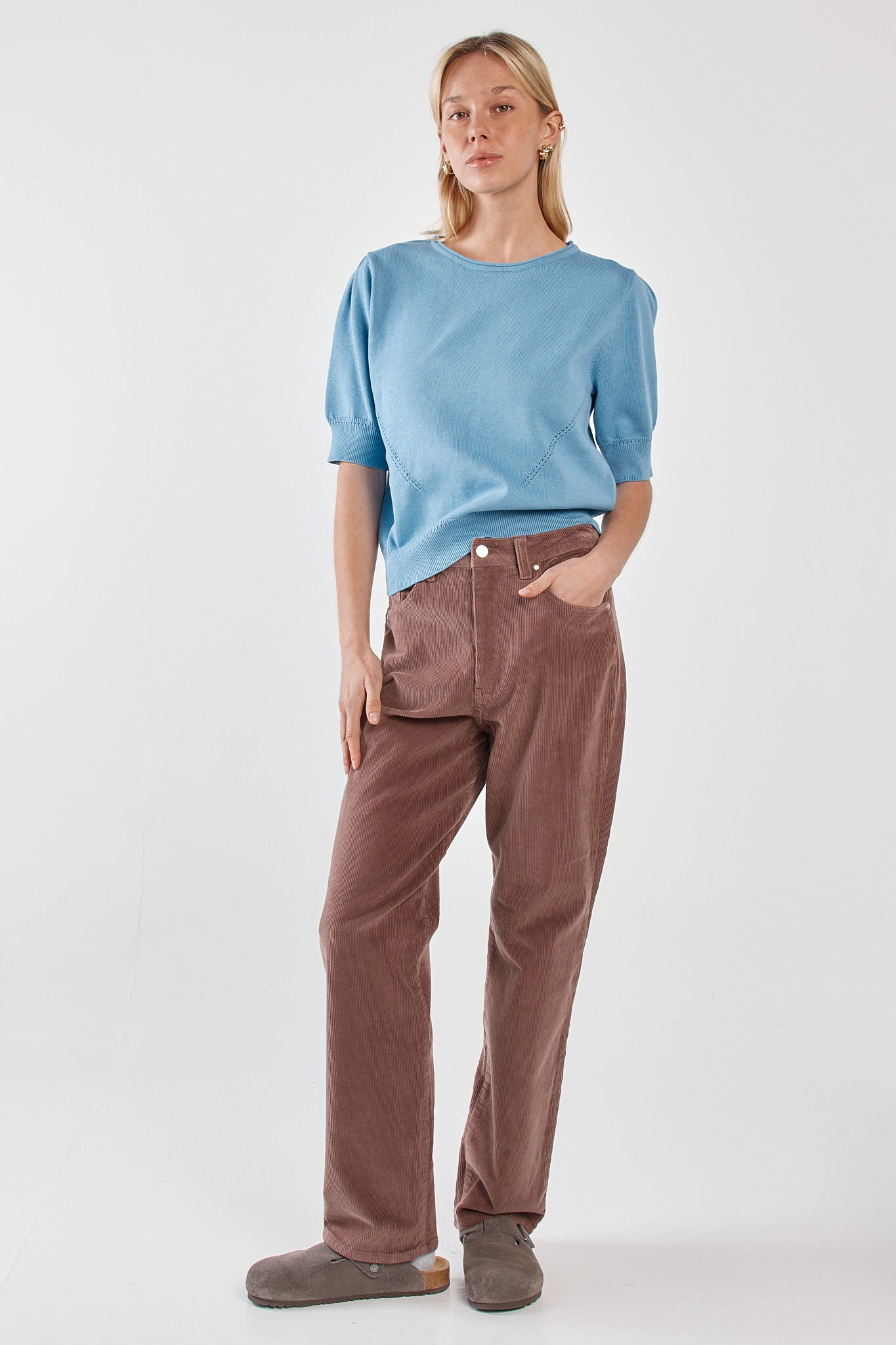 The Esti Pointelle Knit Tee is delicate knitwear with an elevated feel. Pointelle detailing and subtle rib trims add texture while keeping the silhouette polished. The rolled neckline softens the look for effortless wear. A lightweight, transeasonal essential with on-trend charm.