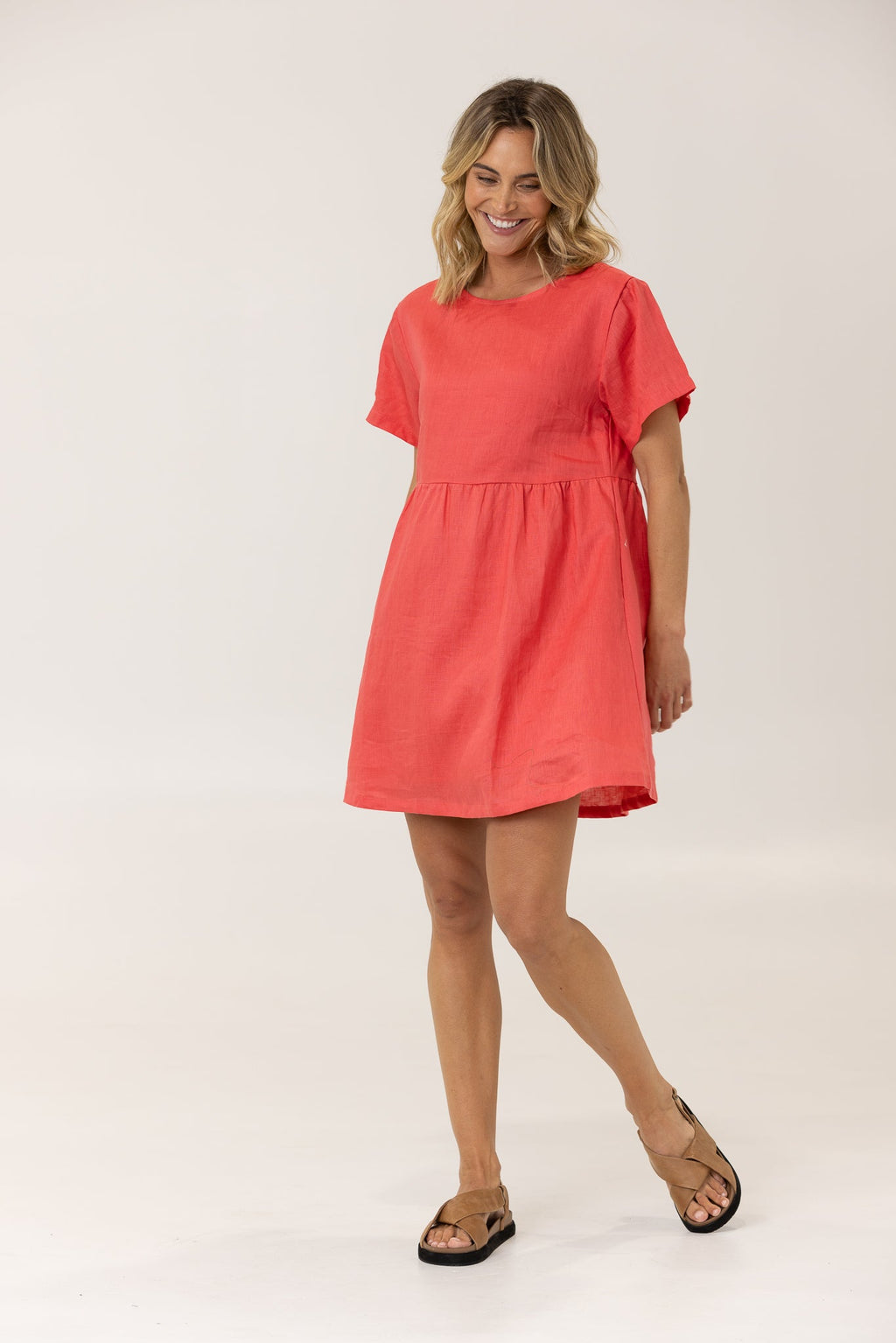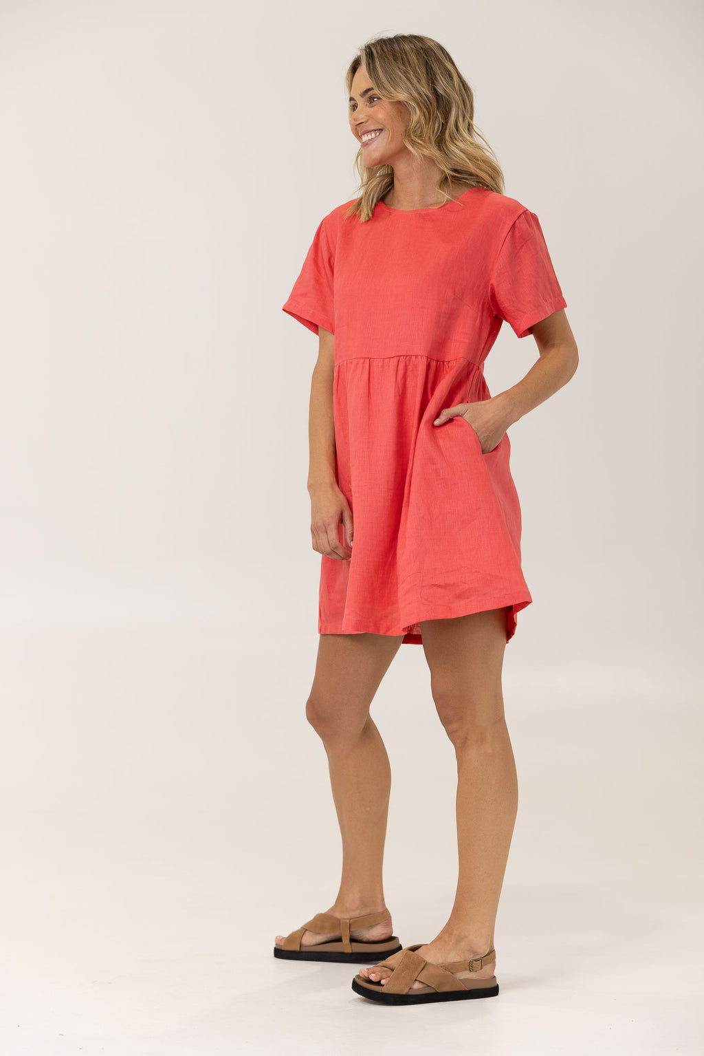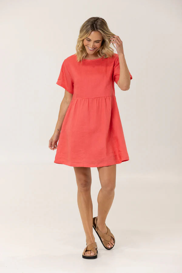 Effortlessly stylish and comfortable, the Harley Linen Tee Dress is your go-to wardrobe essential. Featuring a relaxed smock style, tee shirt sleeves, and a round neckline, this dress is perfect for everyday wear. With a flattering above knee length and fully lined design, it also includes inseam pockets for added convenience. Make a statement in this Watermelon colour.