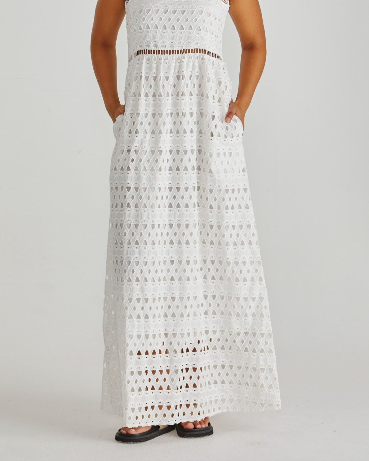The Kali Broderie Dress is pure sunshine energy. With adjustable straps, a tie-back detail and broderie texture, it’s soft, feminine and fun. Lined for comfort, it’s the dress you’ll live in all summer long.