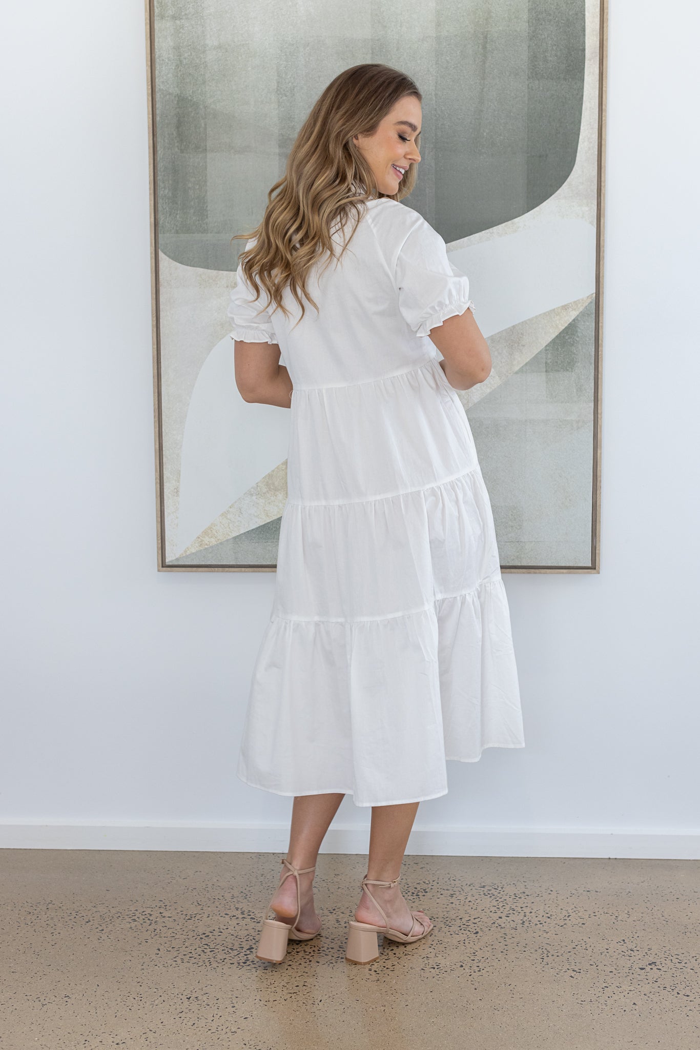 Channel elegance and style with the Laura Midi. A collar and button down front are both elements of a sophisticated look, and puff sleeves combined with the midi length add an extra femme touch - as if she weren't pretty enough!