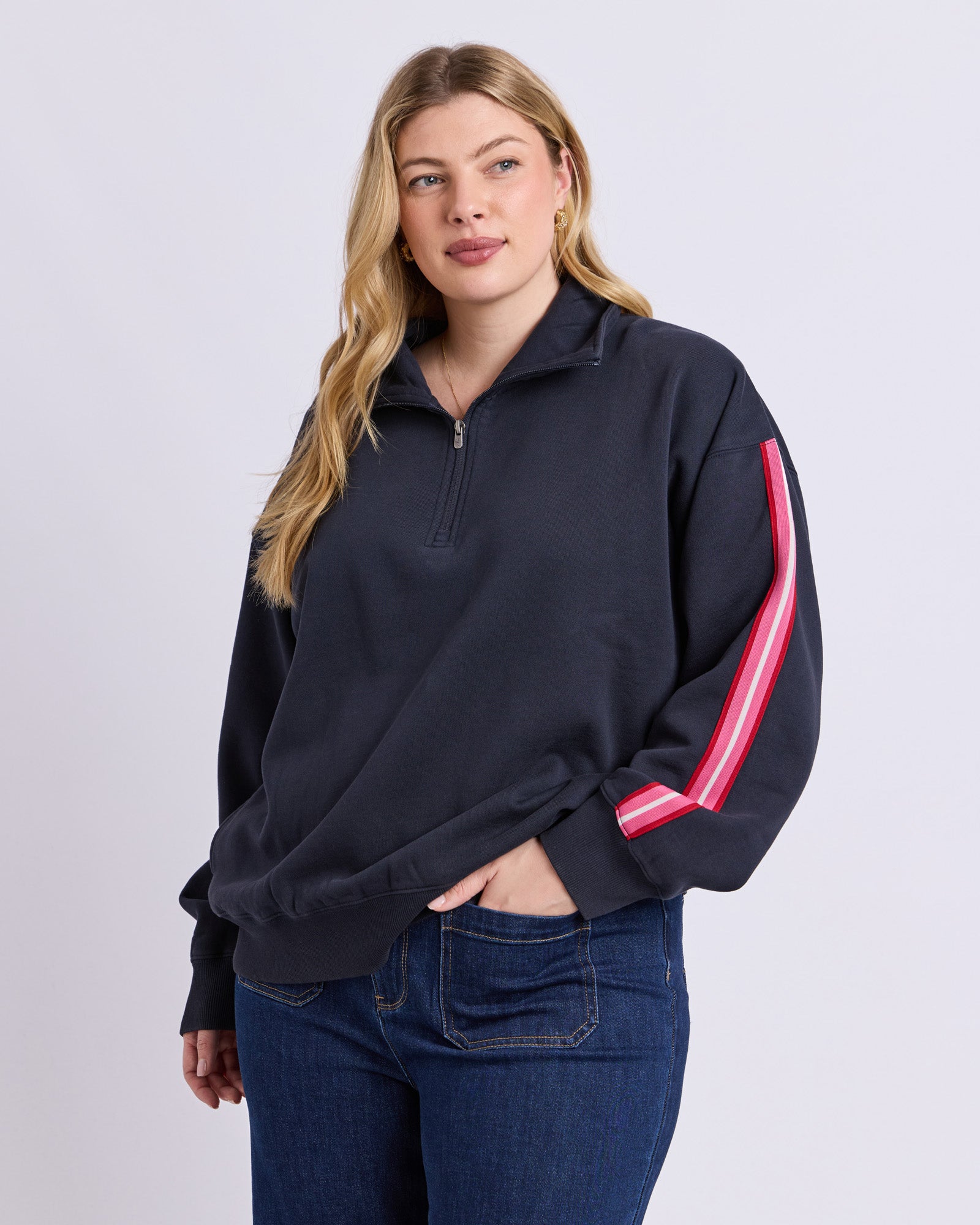The Elm Lover 1/4 Zip delivers sporty-casual style with colourful sleeve tape and an oversized fit. Crafted from soft brushed fleece, its designed for effortless layering. Pair with trackpants or denim for a relaxed, everyday look.