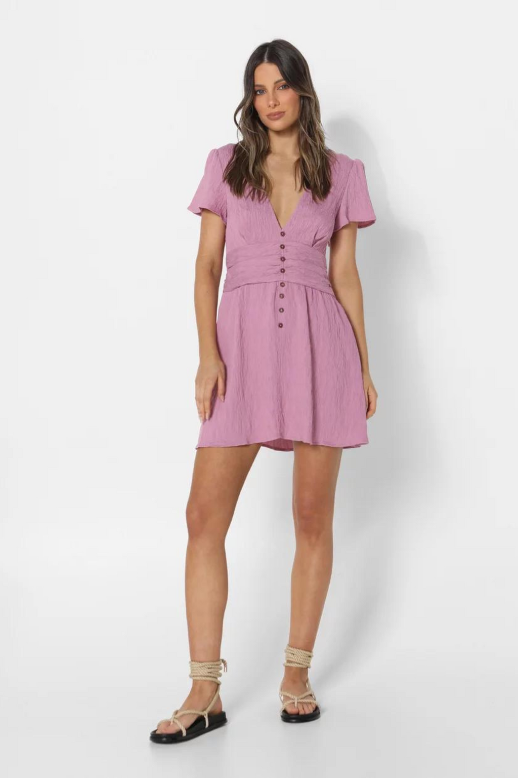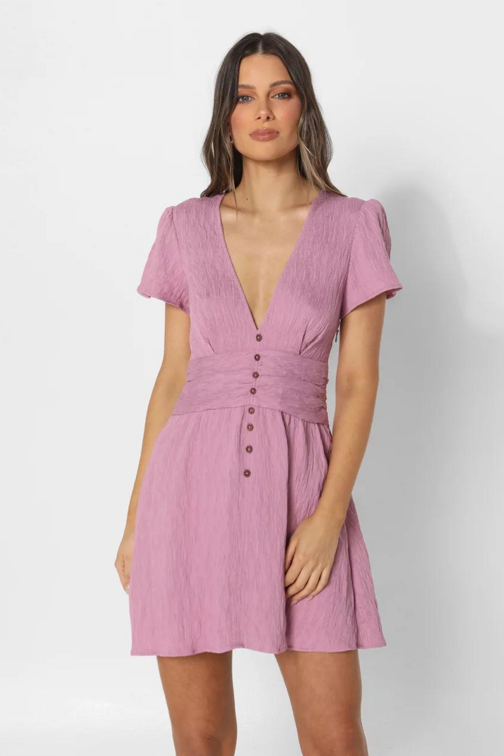 Look gorgeous in the Maya Mini Dress! This bright magenta V-neck dress features decorative buttons, short sleeves, an invisible zipper and a lovely curly lettuce hem. Perfect for any occasion!