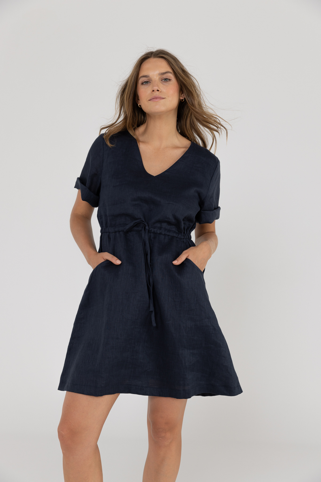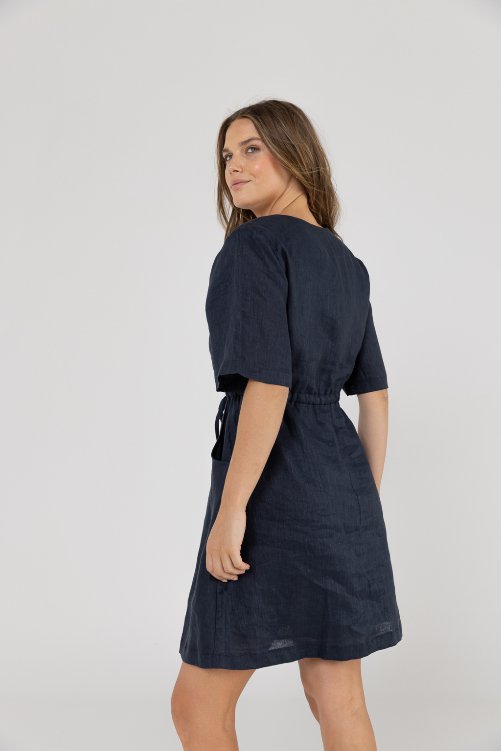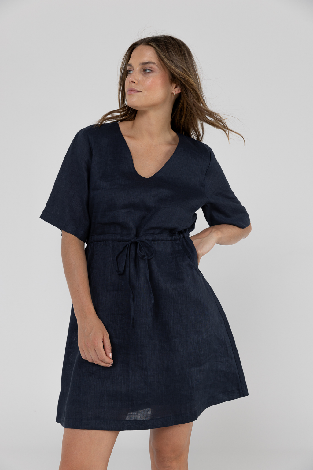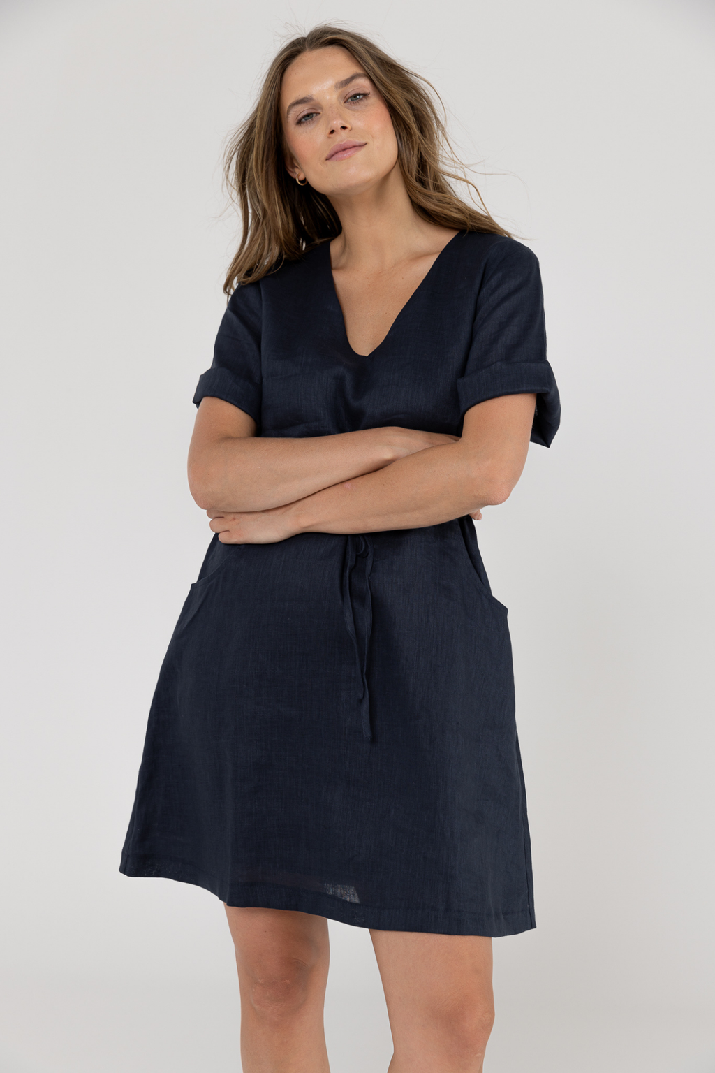The Riley Linen Dress is perfect for any occasion. Made with high-quality linen, it offers both comfort and style. The flattering navy color complements all skin tones. Its versatile design allows for easy dressing up or down. Invest in this timeless piece for a wardrobe staple.