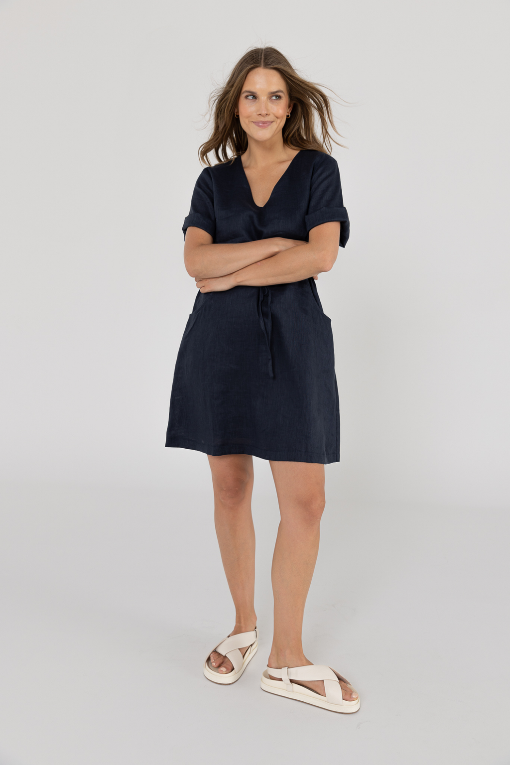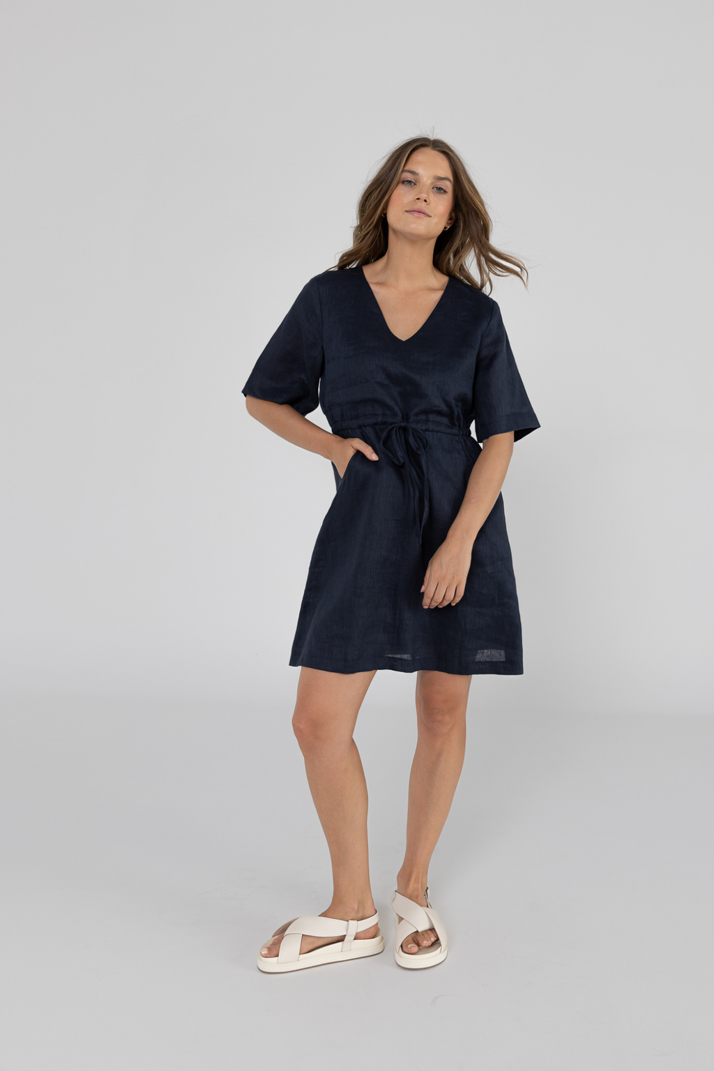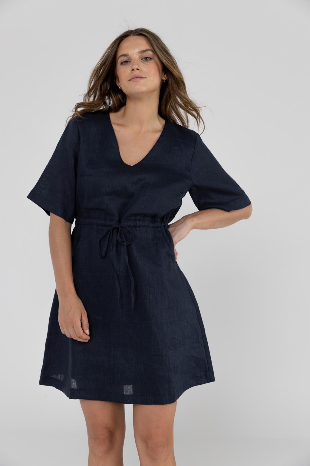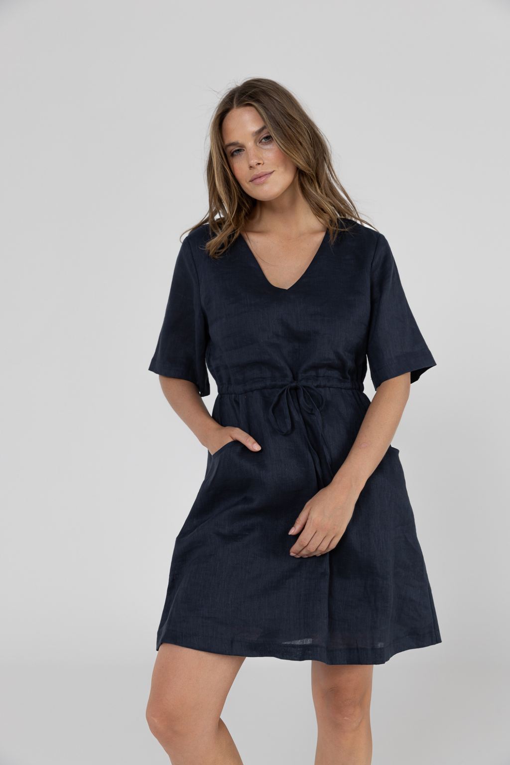 The Riley Linen Dress is perfect for any occasion. Made with high-quality linen, it offers both comfort and style. The flattering navy color complements all skin tones. Its versatile design allows for easy dressing up or down. Invest in this timeless piece for a wardrobe staple.