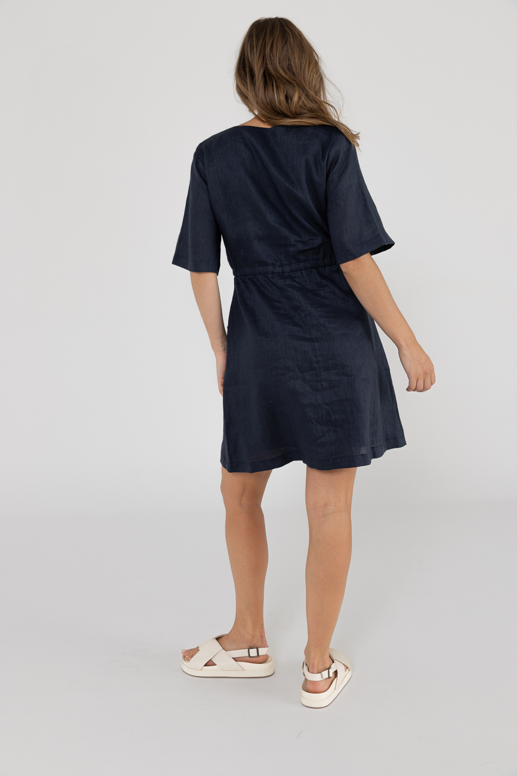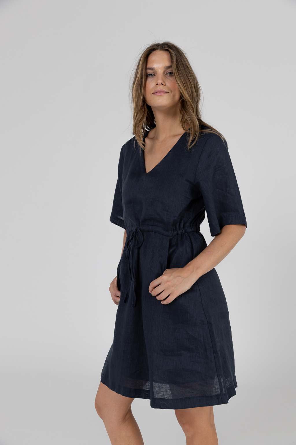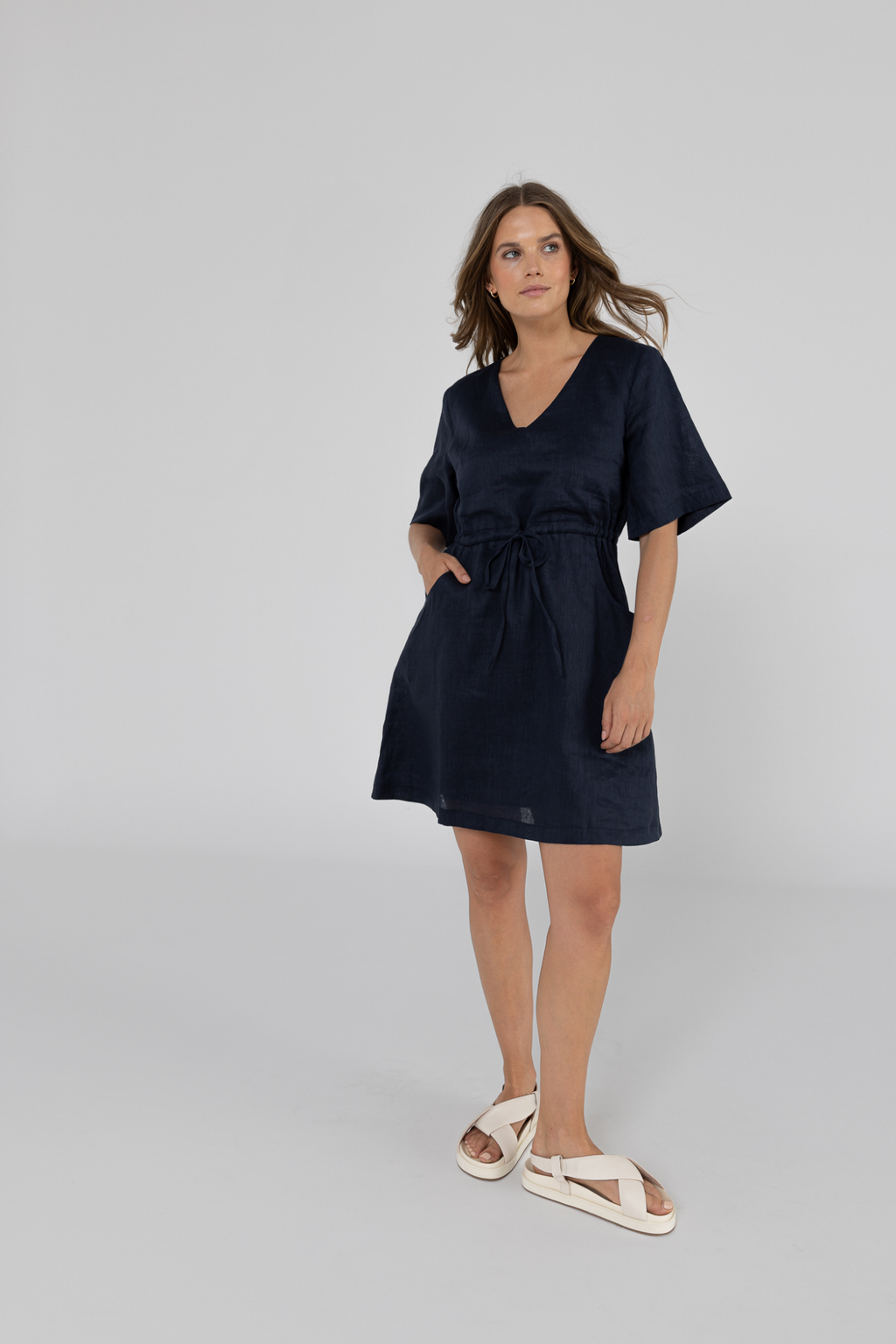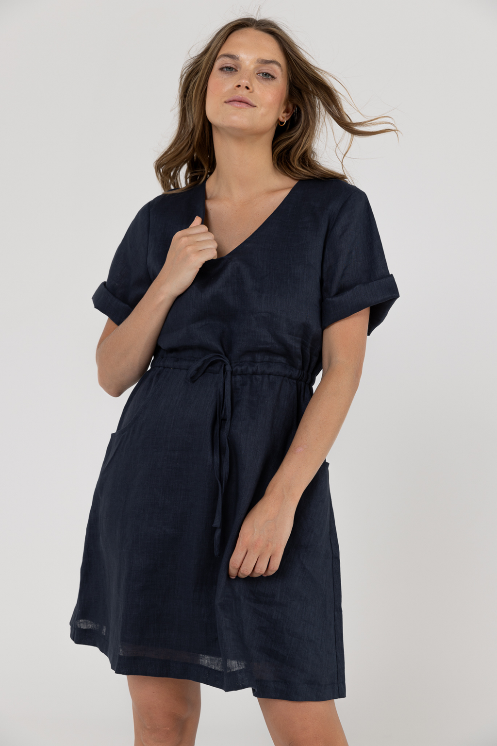 The Riley Linen Dress is perfect for any occasion. Made with high-quality linen, it offers both comfort and style. The flattering navy color complements all skin tones. Its versatile design allows for easy dressing up or down. Invest in this timeless piece for a wardrobe staple.